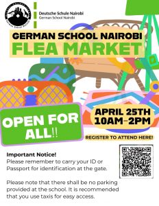 Am Samstag, den 25. April, von 10:00 bis 14:00 Uhr findet an der Deutschen Schule Nairobi unser jährlicher Flohmarkt statt.